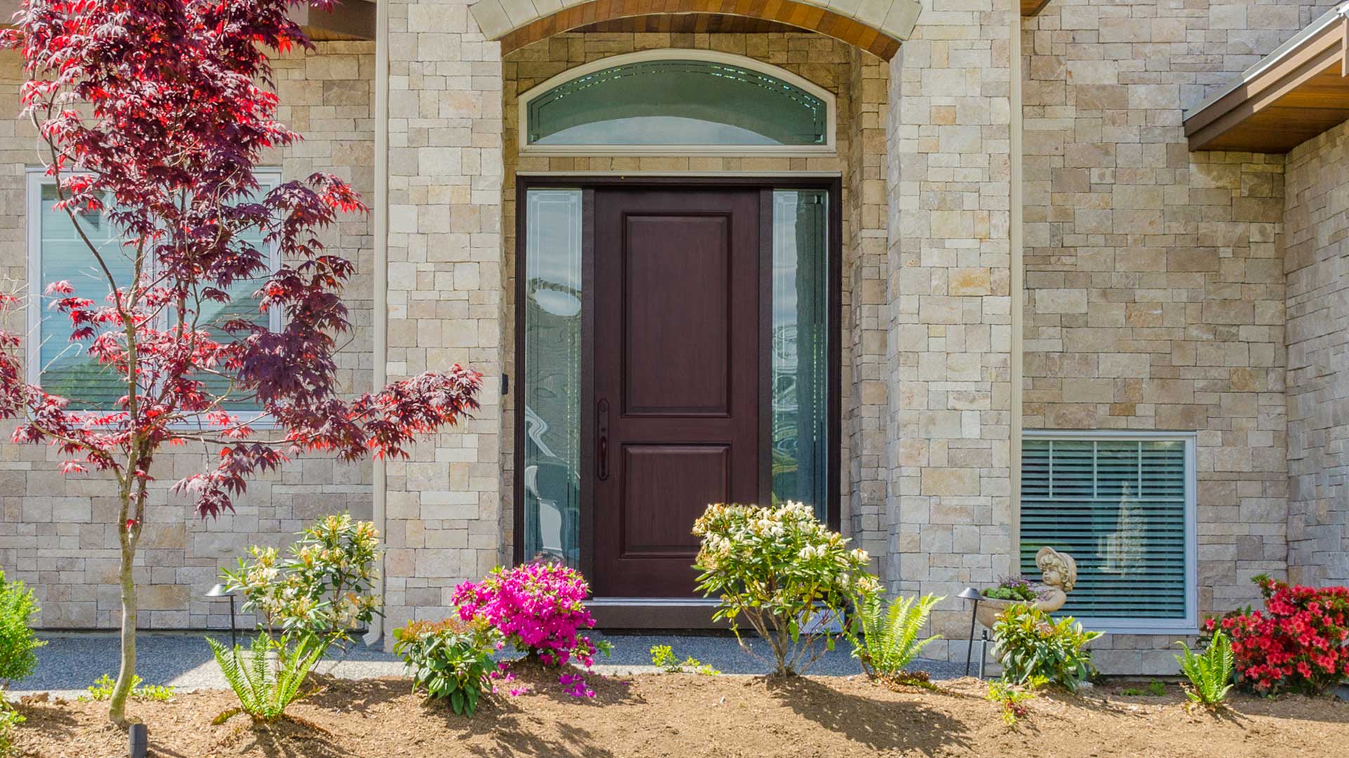 The ultimate goal was to have the look of the solid wood door. We decided to go with the 2-panel mahogany grain model and custom stain to match the door with soffits. The result is a beautiful fiberglass door that will last at least 20 years.